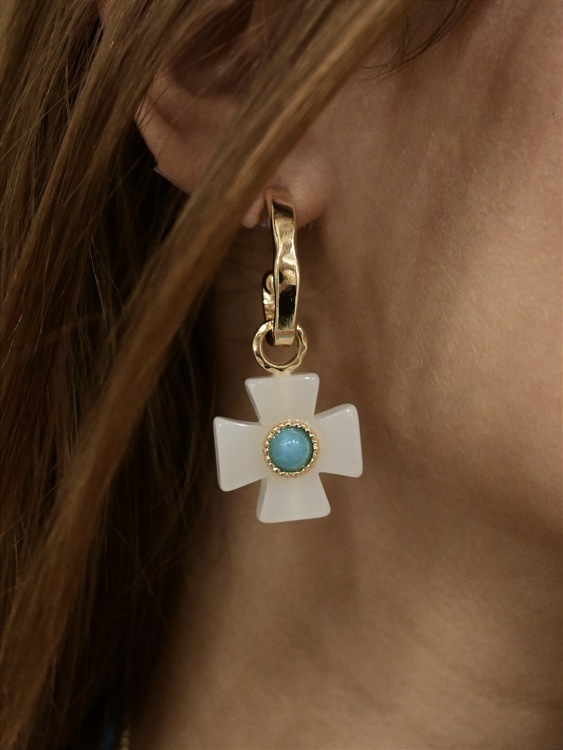 ATENÇÃO: A compra é referente ao par da Argola Cruz Turquesa. As fotos referente a produções são meramente ilustrativas como sugestão de uso.