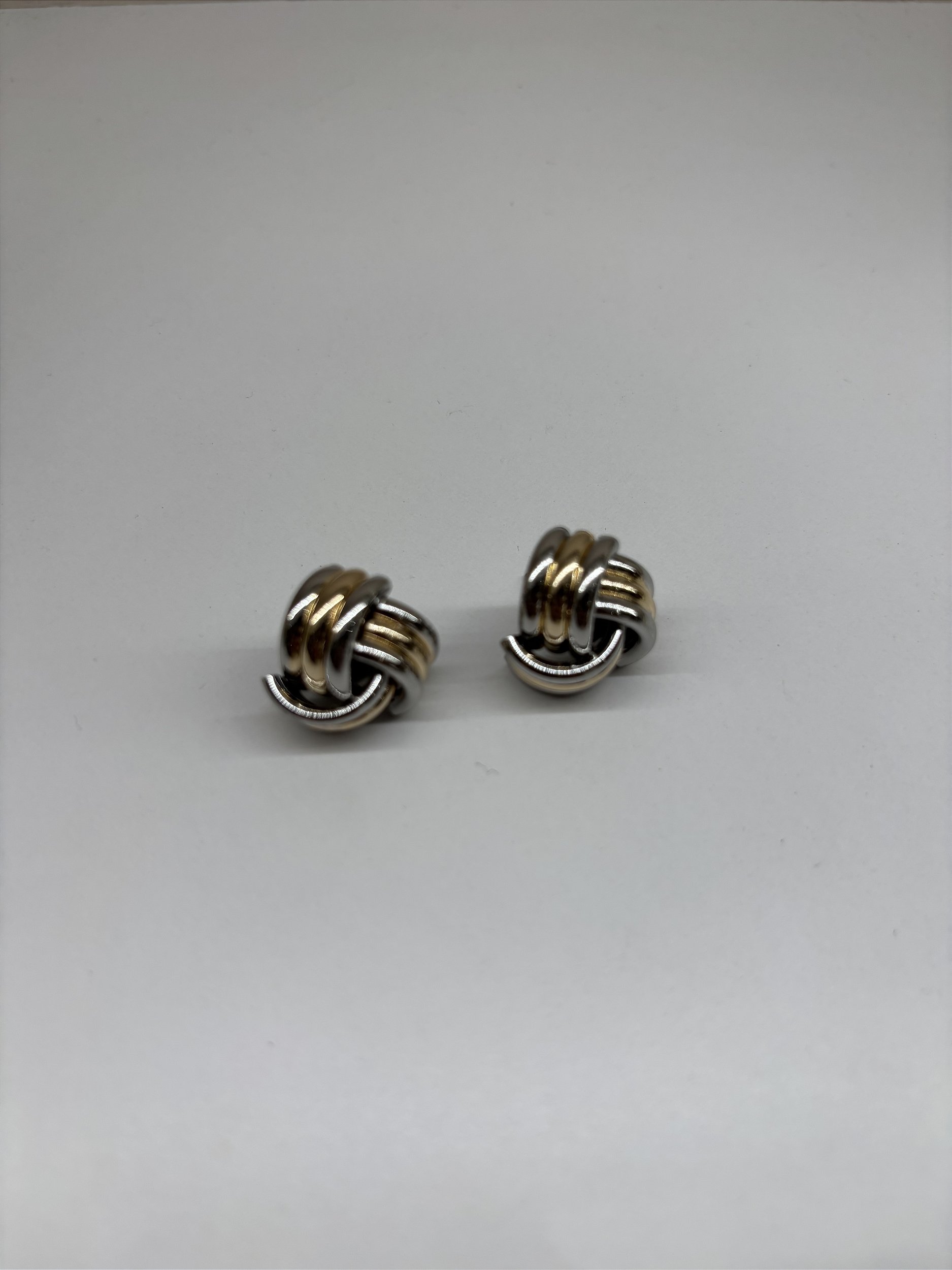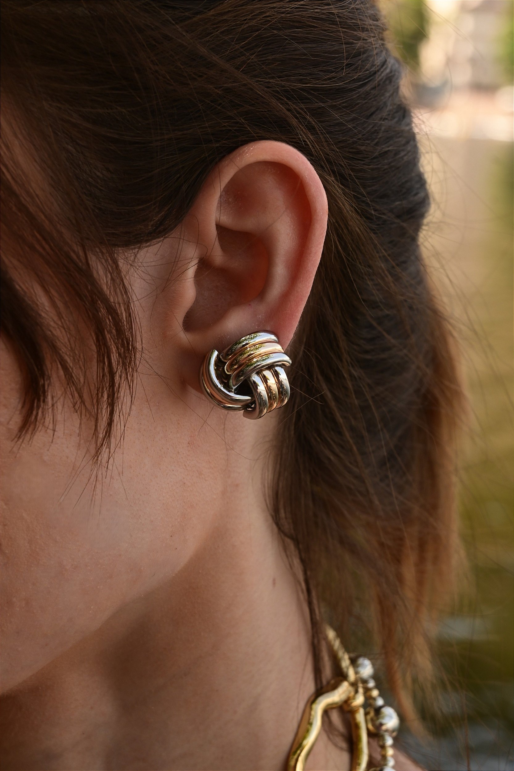 Brinco pequeno colado a orelha, fazendo o mix de banhos do dourado com prata. A ordem das cores podem alterar.