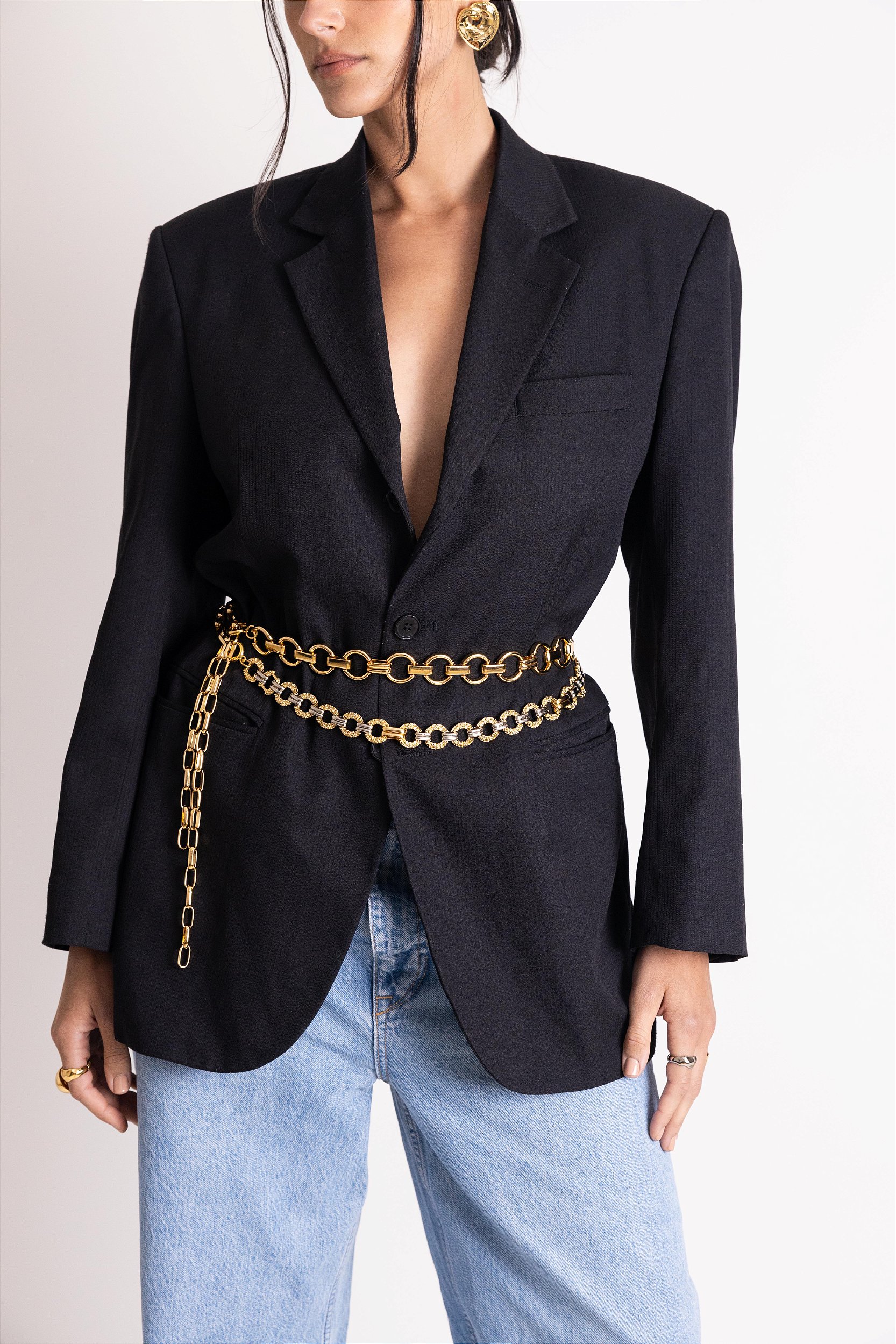Cinto com corrente bicolor e corrente dourada.