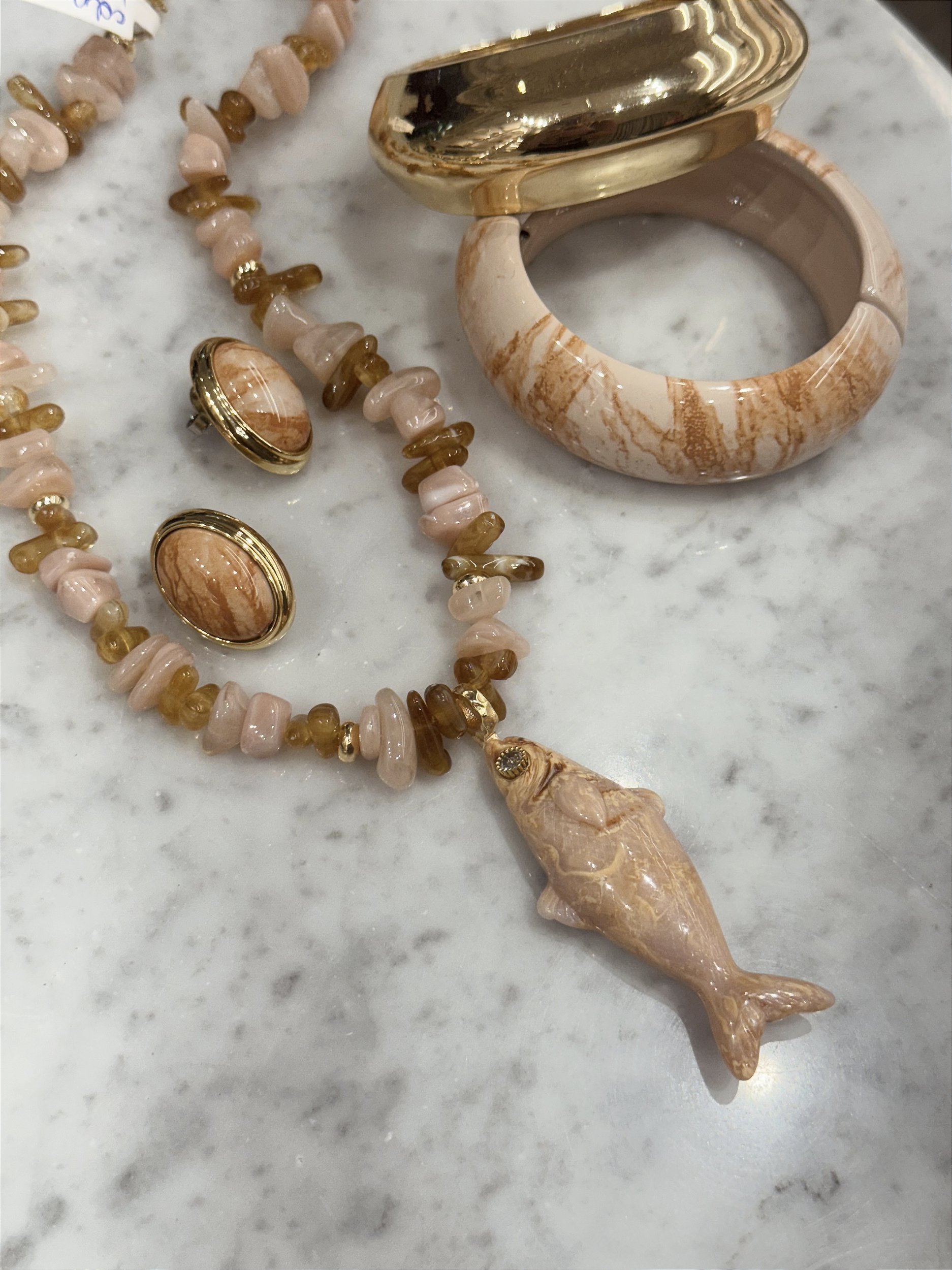 Colar de cascalhos com pingente de peixe de resina.